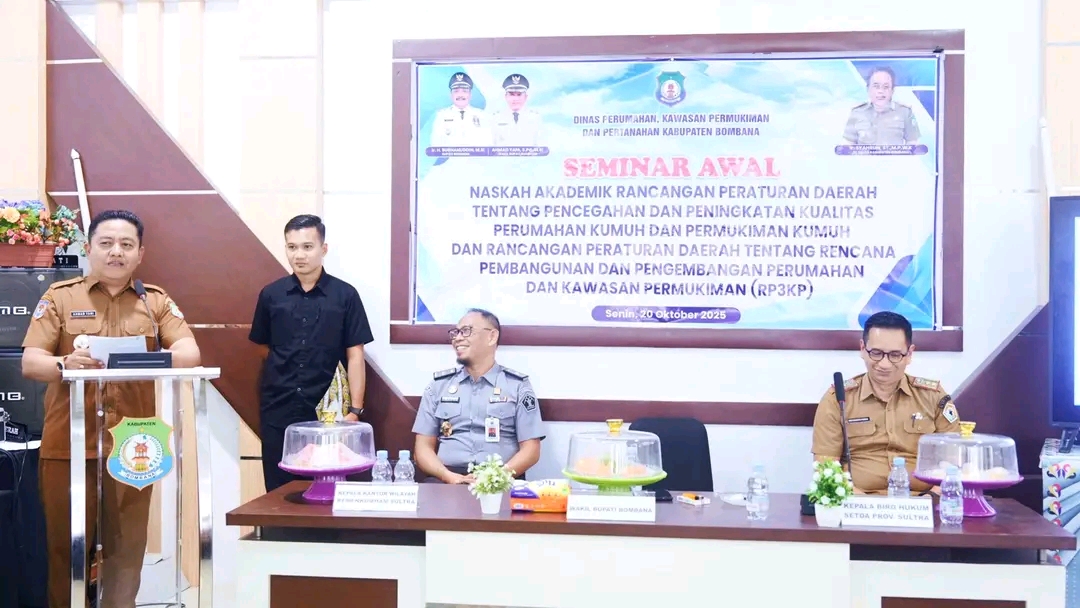 Rumbia, Infobombana.id – Wakil Bupati Bombana, Ahmad Yani, S.Pd., M.Si, menegaskan pentingnya regulasi yang berbasis riset dan kebutuhan riil masyarakat dalam menata kawasan permukiman. Hal itu disampaikannya saat mewakili Bupati Bombana membuka Seminar Awal Naskah Akademik dua Raperda strategis: tentang Pencegahan dan Peningkatan Kualitas Perumahan Kumuh dan Permukiman Kumuh, serta Rencana Pembangunan dan Pengembangan Perumahan dan Kawasan Permukiman (RP3KP), di Aula Bappeda Bombana, Senin (20/10/2025).