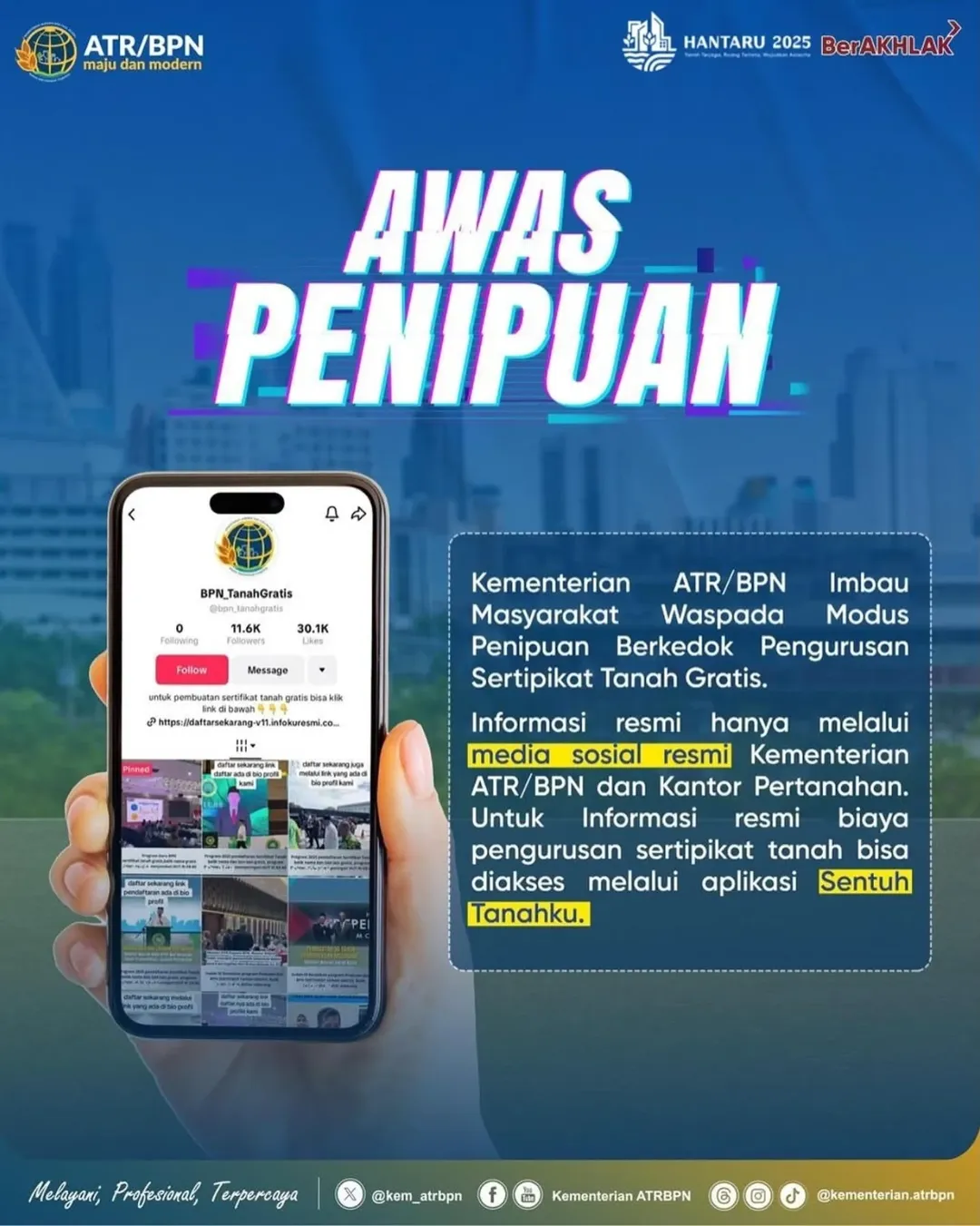 Melalui keterangan resmi, ATR/BPN menegaskan bahwa seluruh informasi terkait layanan pertanahan hanya disampaikan melalui kanal resmi kementerian dan kantor pertanahan di daerah. “Kami mengajak masyarakat agar tidak mudah percaya pada tawaran dari pihak yang tidak bertanggung jawab. Informasi resmi bisa dipantau melalui media sosial resmi Kementerian ATR/BPN maupun Kantor Pertanahan setempat,” tulis imbauan tersebut.