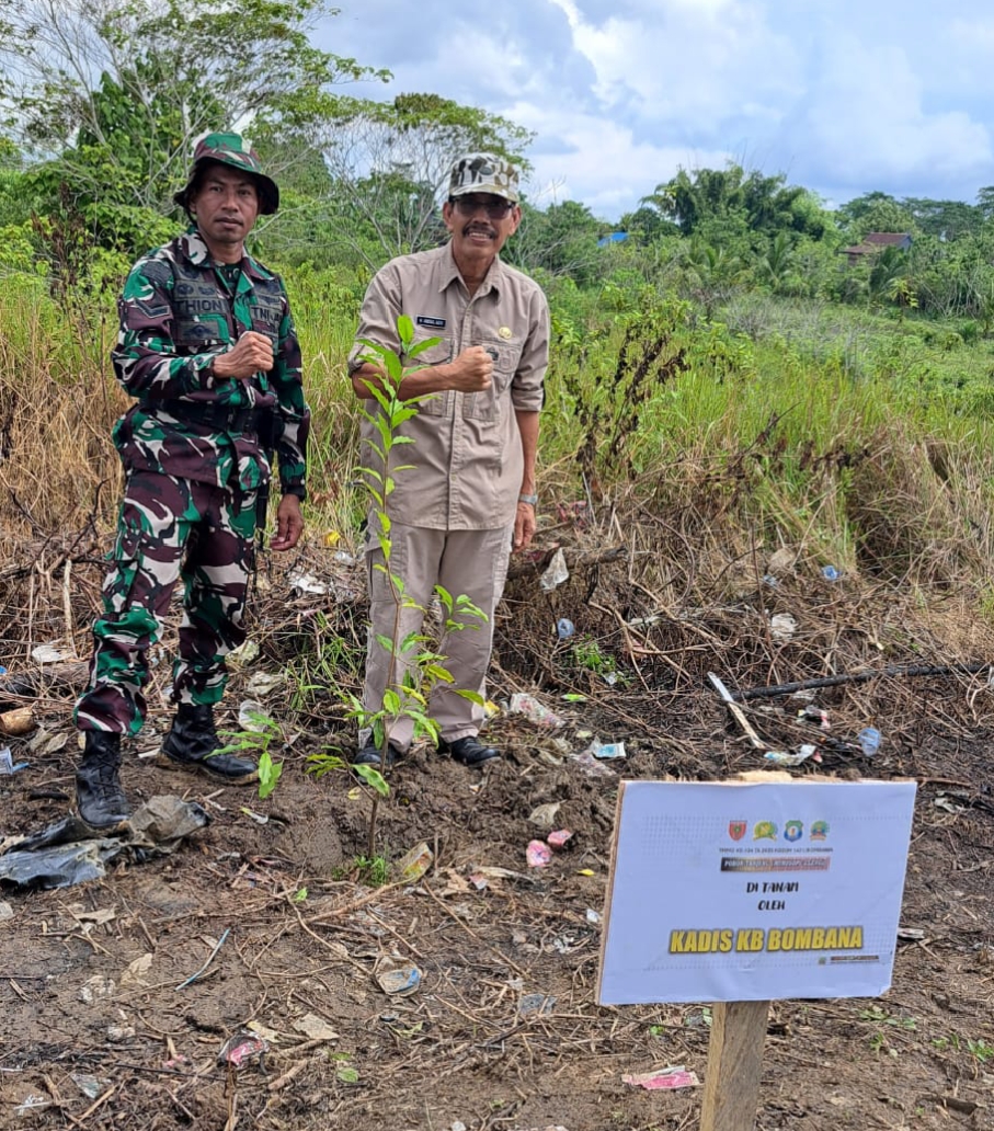 Ketgam; Kepala Dinas Pengendalian Penduduk dan Keluarga Berencana (DPPKB) Kabupaten Bombana, Drs. Abdul Azis, M.Si., bersama anggota TNI Satgas TMMD ke-124 melakukan penanaman pohon di Desa Wia-Wia, Kecamatan Matausu, sebagai simbol kepedulian terhadap lingkungan dan dukungan terhadap program TMMD, Selasa (6/5/2025).