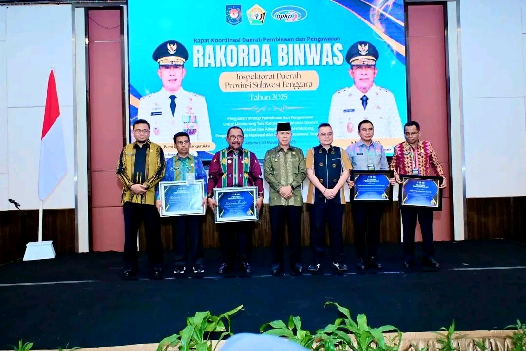 Kendari, Infobombana.id — Pemerintah Kabupaten Bombana kembali mencuri perhatian dalam forum resmi tingkat provinsi. Dalam Rapat Koordinasi Daerah Pembinaan dan Pengawasan (Rakorda Binwas) Inspektorat Daerah Sulawesi Tenggara di Claro Hotel Kendari, Kamis (20/11/2025), Bombana dinobatkan sebagai daerah dengan penyelesaian rekomendasi tindak lanjut tertinggi hasil pengawasan Inspektorat se- Sultra.