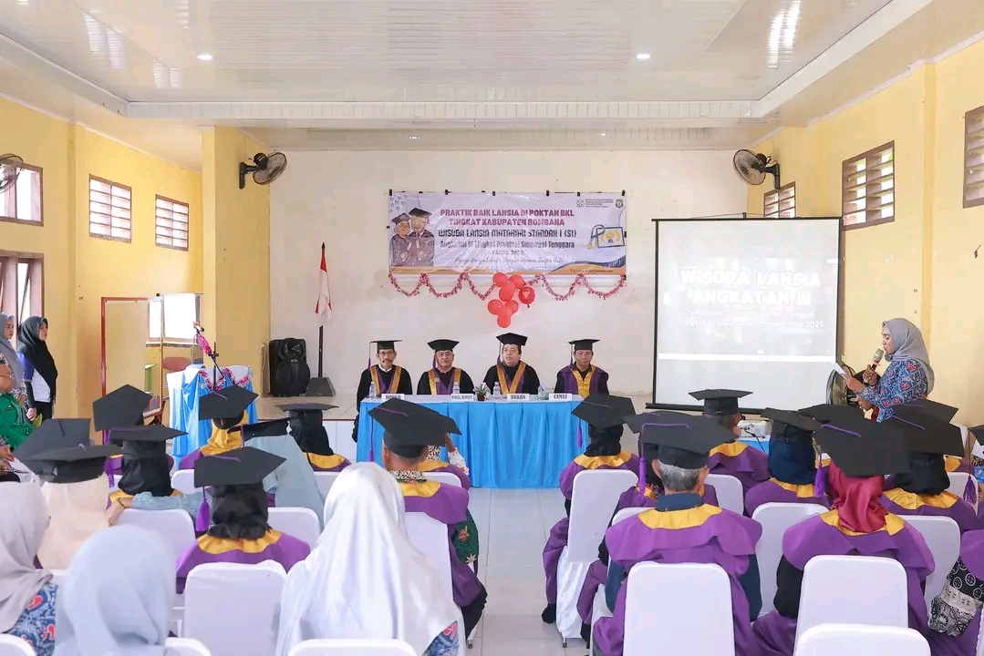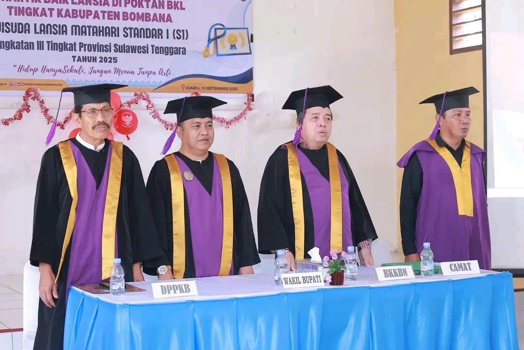 Sebanyak 26 peserta dari Sekolah Lansia BKL Matahari Kelurahan Poea, Kecamatan Rumbia Tengah, resmi diwisuda dalam acara yang penuh haru dan semangat itu. Prosesi dipimpin langsung oleh Wakil Bupati Bombana, Ahmad Yani, S.Pd., M.Si, bersama Kepala Perwakilan BKKBN Provinsi Sultra, Drs. Asmar, M.Si, Kepala Dinas Pengendalian Penduduk dan Keluarga Berencana Kabupaten Bombana, Drs. H. Abdul Azis, M.Si, serta Camat Rumbia Tengah, Yusuf Alison, S.Sos., MM.