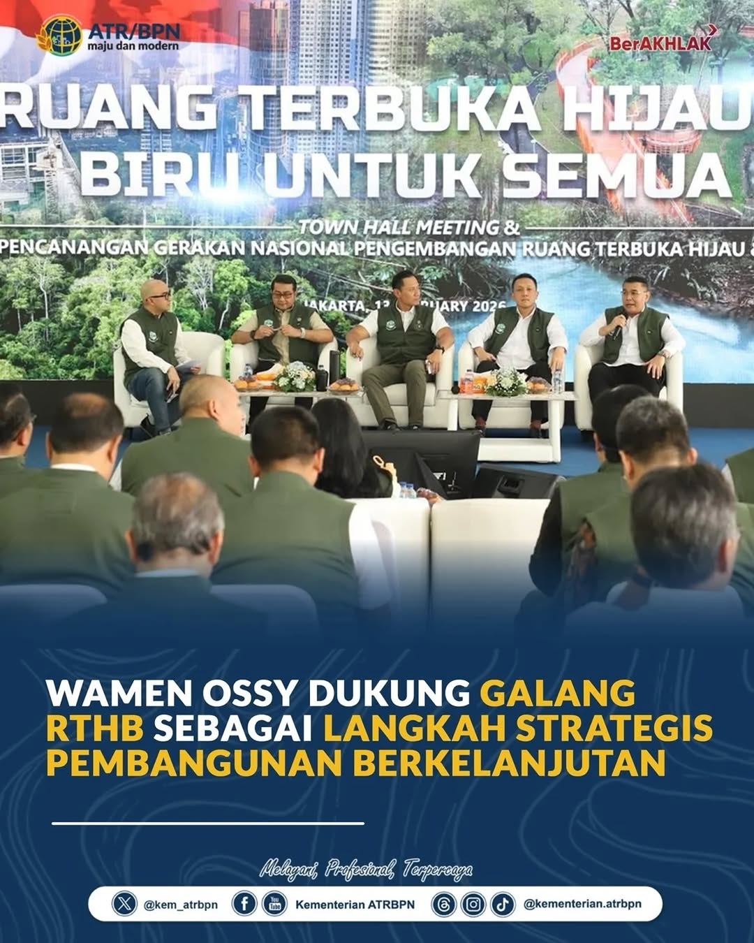 Wakil Menteri Agraria dan Tata Ruang/Wakil Kepala Badan Pertanahan Nasional, Ossy Dermawan, menyatakan dukungannya terhadap gerakan tersebut sebagai langkah strategis menuju pembangunan berkelanjutan. Menurutnya, penguatan ruang terbuka hijau dan biru menuntut perubahan cara pandang masyarakat dalam memaknai ruang hidup.