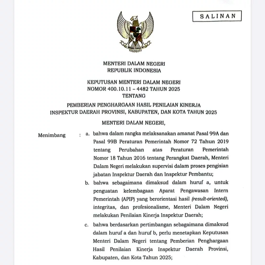 Penilaian tersebut merupakan bentuk apresiasi pemerintah pusat terhadap kinerja Inspektorat Daerah di seluruh Indonesia dalam melaksanakan fungsi pengawasan pemerintahan yang efektif, transparan, dan akuntabel.