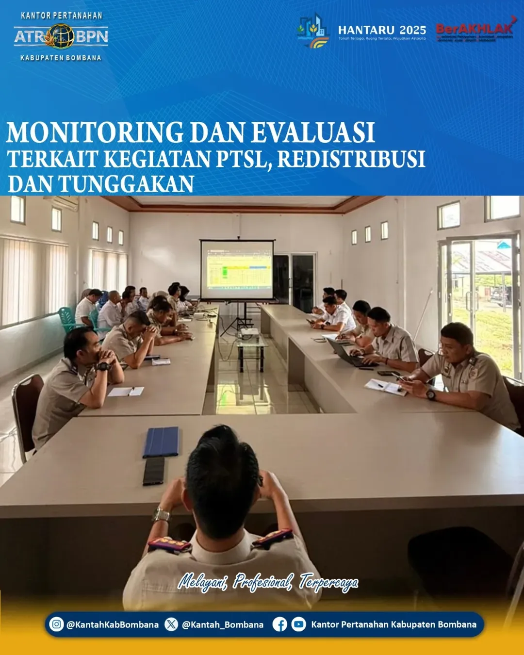 Rumbia, Infobombana.id – Kantor Pertanahan Kabupaten Bombana menggelar kegiatan Monitoring dan Evaluasi (Monev) terhadap program strategis pertanahan, meliputi Pendaftaran Tanah Sistematis Lengkap (PTSL), Redistribusi Tanah, serta penyelesaian tunggakan sertipikasisertipikasi tahun 2025.
