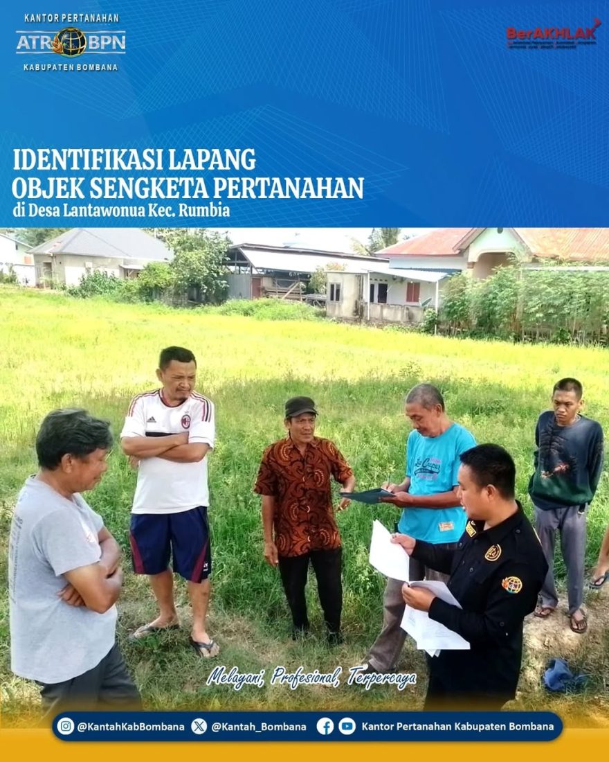 Rumbia, Infobombana.id – Kantor Pertanahan Kabupaten Bombana melalui Seksi Penanganan Sengketa dan Perkara melakukan identifikasi lapangan terhadap objek sengketa pertanahan yang berlokasi di Desa Lantawonua, Kecamatan Rumbia, Kabupaten Bombana. Langkah ini merupakan bagian dari upaya penyelesaian konflik pertanahan secara profesional dan transparan.