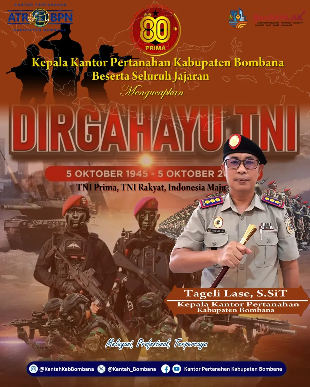 Rumbia, Infobombana.if – Kepala Kantor Pertanahan Kabupaten Bombana, Tageli Lase, S.SiT, bersama seluruh jajaran mengucapkan Dirgahayu Tentara Nasional Indonesia (TNI) ke-80, yang diperingati setiap 5 Oktober.