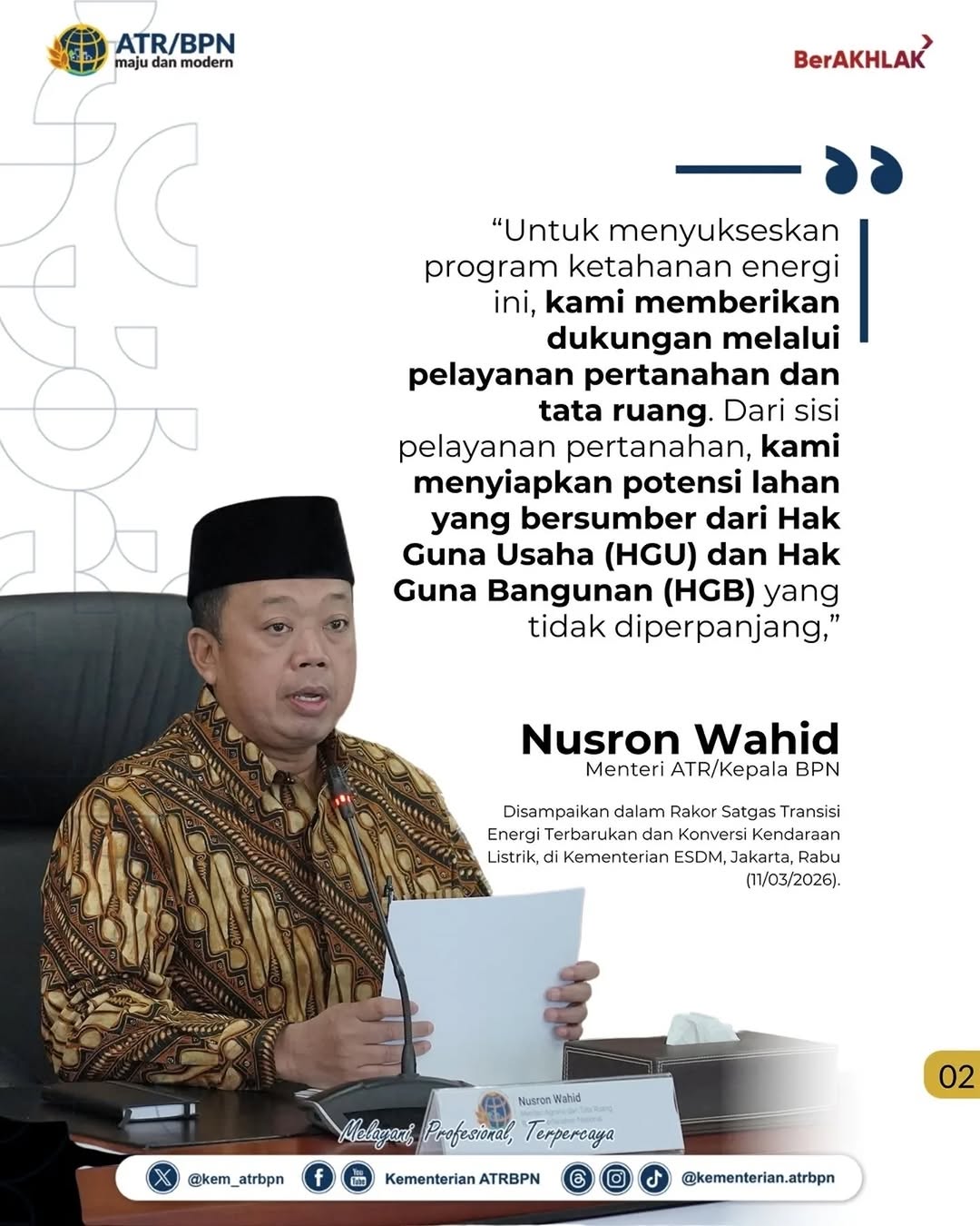 Hal itu disampaikan Nusron dalam Rapat Koordinasi Satuan Tugas (Satgas) Transisi Energi Terbarukan dan Konversi Kendaraan Listrik yang digelar di Kementerian Energi dan Sumber Daya Mineral (ESDM), Jakarta, Rabu (11/03/2026).
