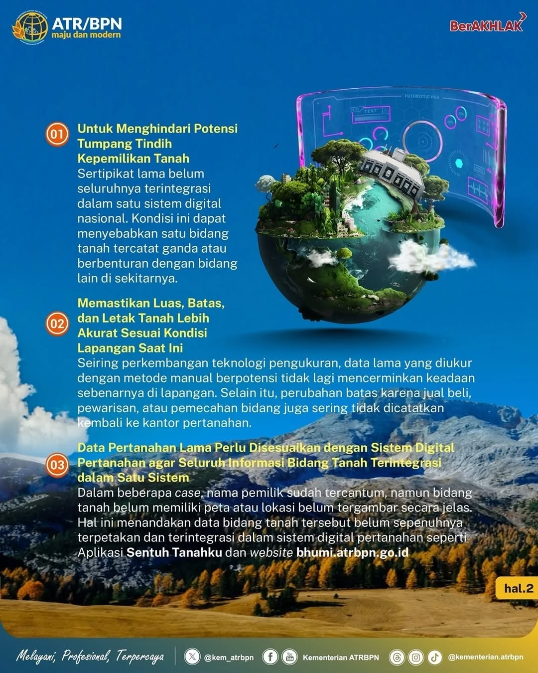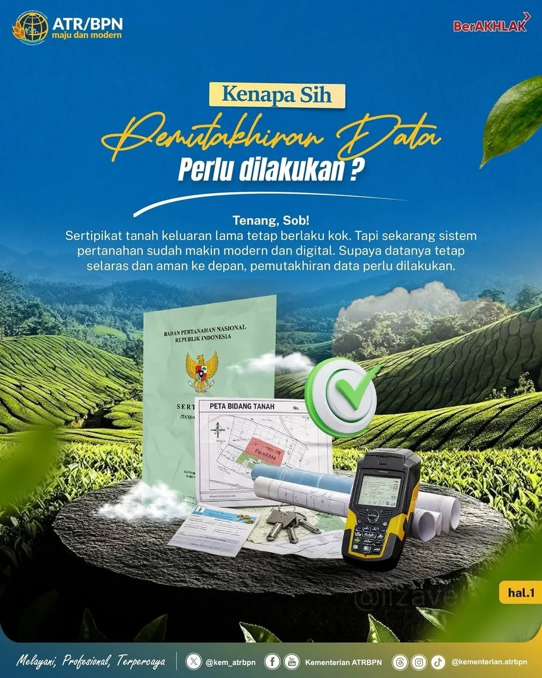 Melalui kampanye ini, ATR/BPN mengajak masyarakat untuk secara aktif mengecek data pertanahannya dan segera melakukan pemutakhiran. Upaya tersebut merupakan bagian dari komitmen ATR/BPN dalam mewujudkan pelayanan pertanahan yang profesional, terpercaya, serta mendukung kepastian hukum di bidang agraria.