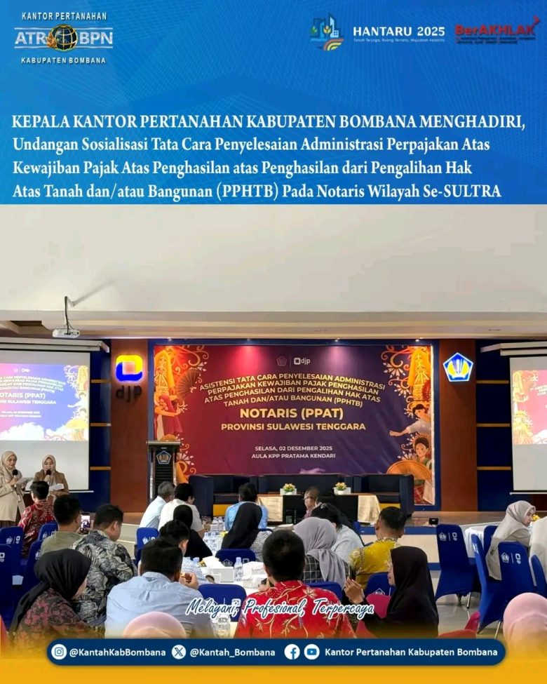 Kendari, Infobombana.id –Kepala Kantor Pertanahan Kabupaten Bombana, Tageli Lase, S. SIT, menghadiri kegiatan sosialisasi tata cara penyelesaian administrasi perpajakan atas kewajiban Pajak Penghasilan dari Pengalihan Hak atas Tanah dan/atau Bangunan (PPHTB) yang digelar Direktorat Jenderal Pajak melalui KPP Pratama Kendari, Selasa (2/12/2025).