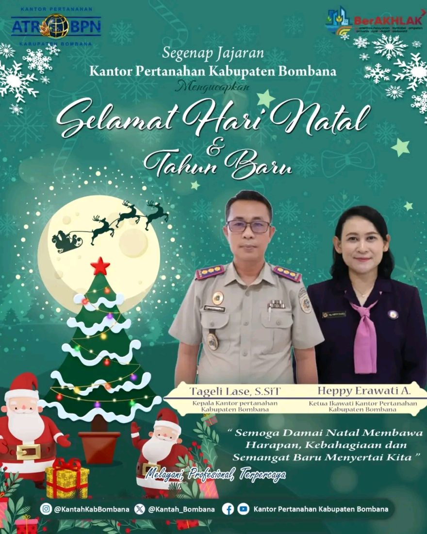 Rumbia, Infobombana.id – Kepala Kantor Pertanahan Kabupaten Bombana, Tageli Lase, S.SIT, beserta segenap jajaran Kantor Pertanahan Kabupaten Bombana menyampaikan ucapan Selamat Hari Natal 2025 dan Tahun Baru 2026 kepada seluruh masyarakat, khususnya umat Kristiani.