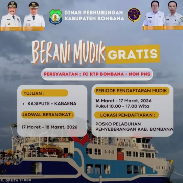 Rumbia, Infobombana.id – Pemerintah Kabupaten Bombana membuka program mudik gratis bagi warga yang hendak pulang kampung menjelang Hari Raya Idulfitri 2026. Program ini difokuskan pada rute penyeberangan laut Kasipute menuju Pulau Kabaena, wilayah yang setiap tahun mengalami lonjakan penumpang pada masa arus mudik.