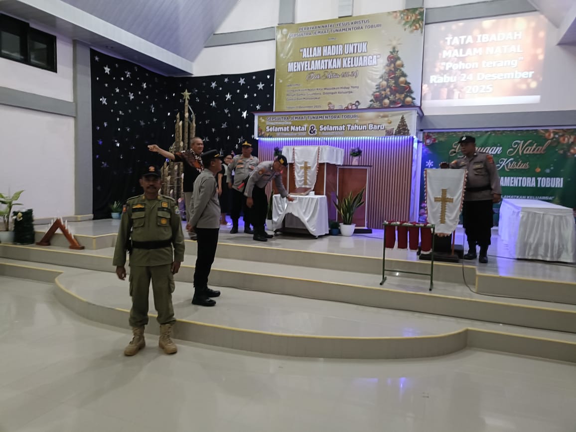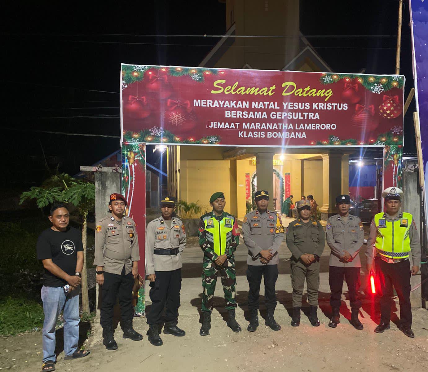 Rumbia, Infobombana.id Aparat keamanan di Kabupaten Bombana, Sulawesi Tenggara, mengerahkan personel gabungan untuk mengamankan pelaksanaan ibadah malam misa Natal, Rabu, 24/12/2025). Pengamanan dilakukan serentak di delapan gereja yang tersebar di sejumlah kecamatan, mulai pukul 18.00 hingga 21.00 Wita.