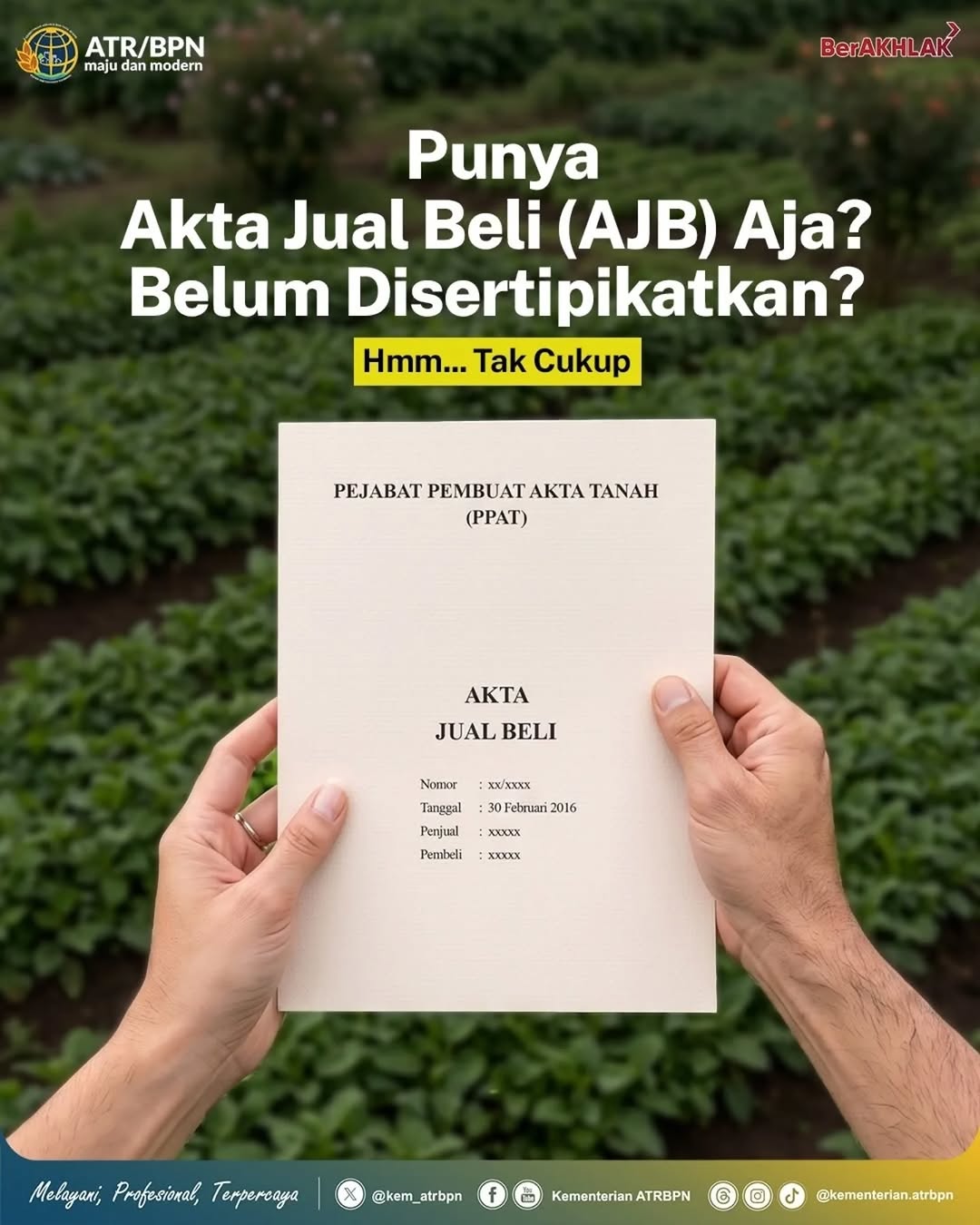 Berdasarkan informasi resmi dari Kementerian Agraria dan Tata Ruang/Badan Pertanahan Nasional (ATR/BPN) melalui infografis yang dipublikasikan di kanal media sosial resminya, masyarakat diimbau untuk segera mensertipikatkan tanah meskipun telah memiliki AJB, guna mendapatkan kepastian hukum yang jelas.