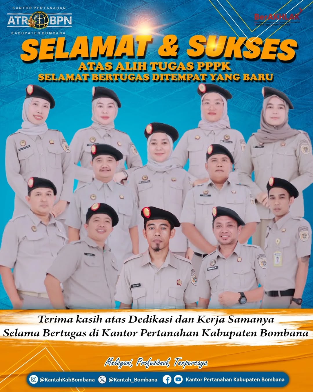 Keluarga besar Kantor Pertanahan Bombana pun berharap para PPPK yang melanjutkan tugas di tempat baru tetap menjaga integritas, profesionalisme, serta semangat pelayanan kepada masyarakat.