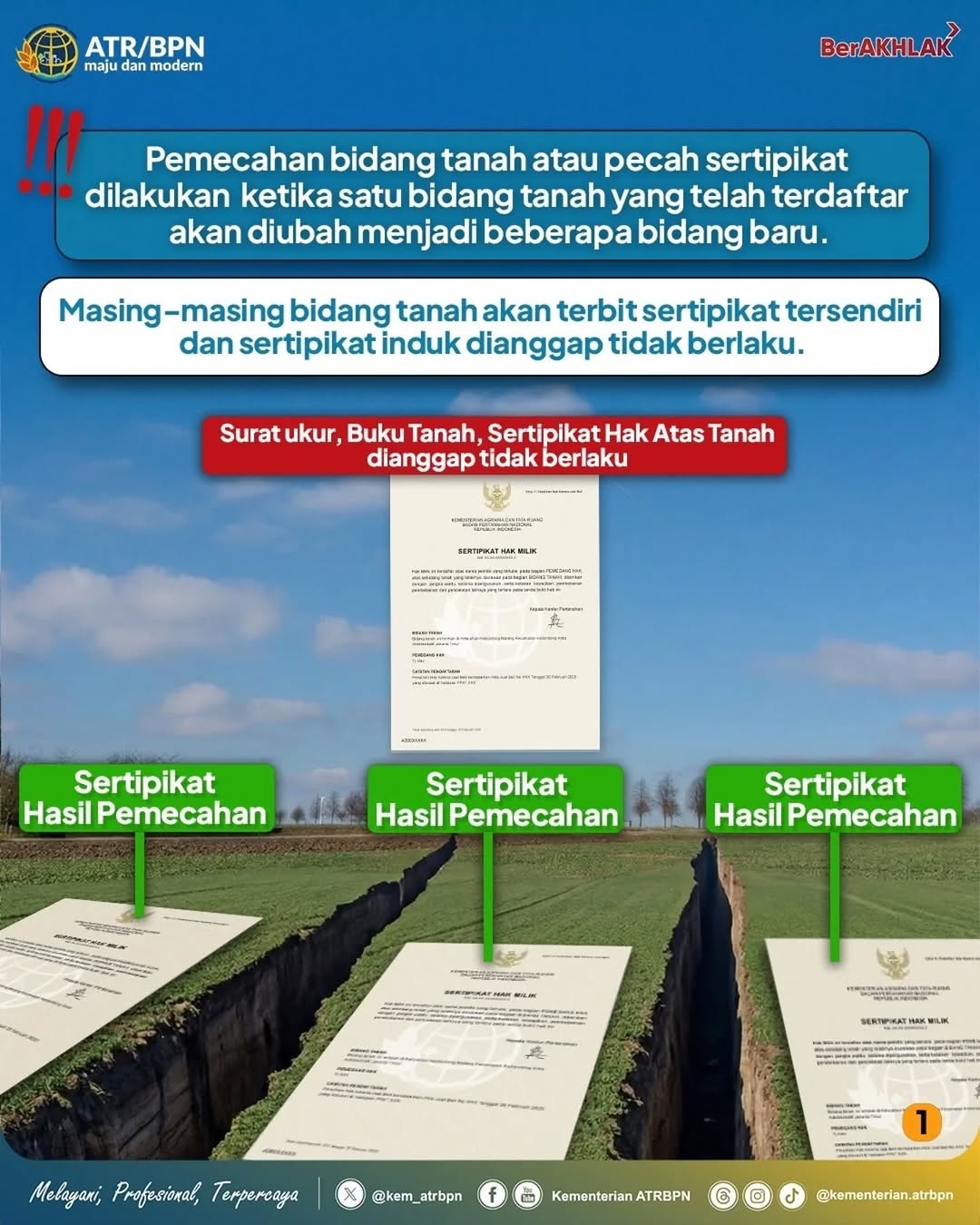 Selain itu, dokumen pendukung seperti surat ukur, buku tanah, dan sertipikat hak atas tanah lama juga tidak berlaku setelah proses pemecahan selesai dilakukan.
