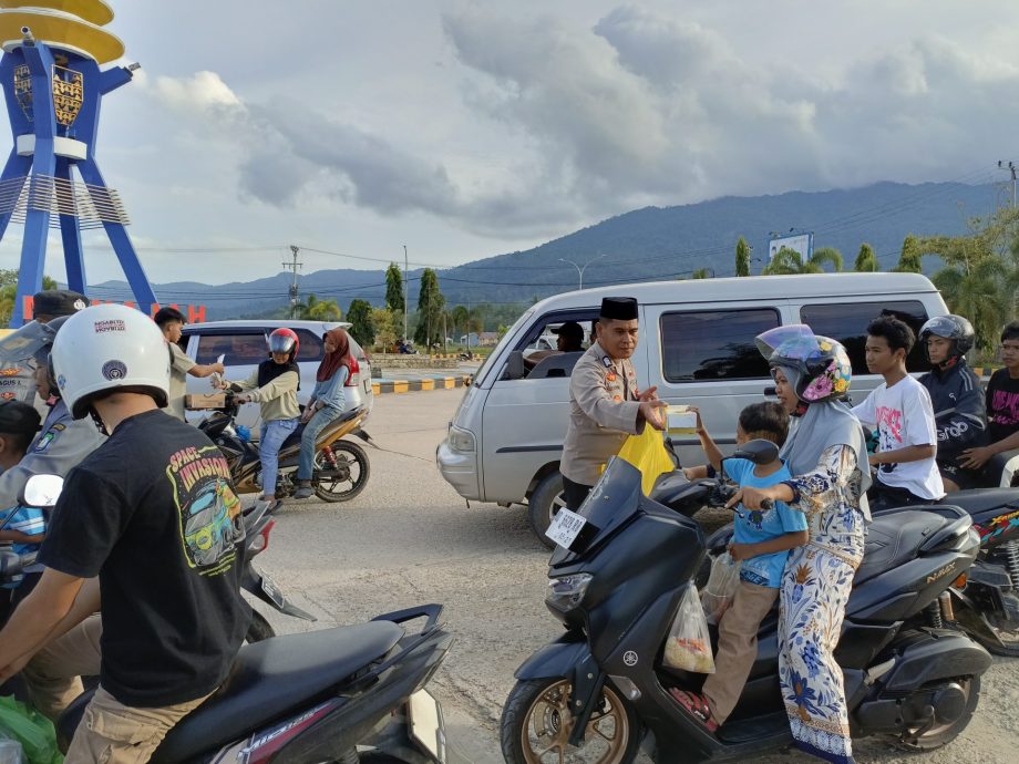 Di bundaran itu, personel gabungan Seksi Humas, Hukum, dan Seksi Pengawasan Polres Bombana membagikan bingkisan kecil yang maknanya tak sederhana. Ada gelas-gelas es buah yang berembun, serta kotak berisi kudapan pembuka puasa.